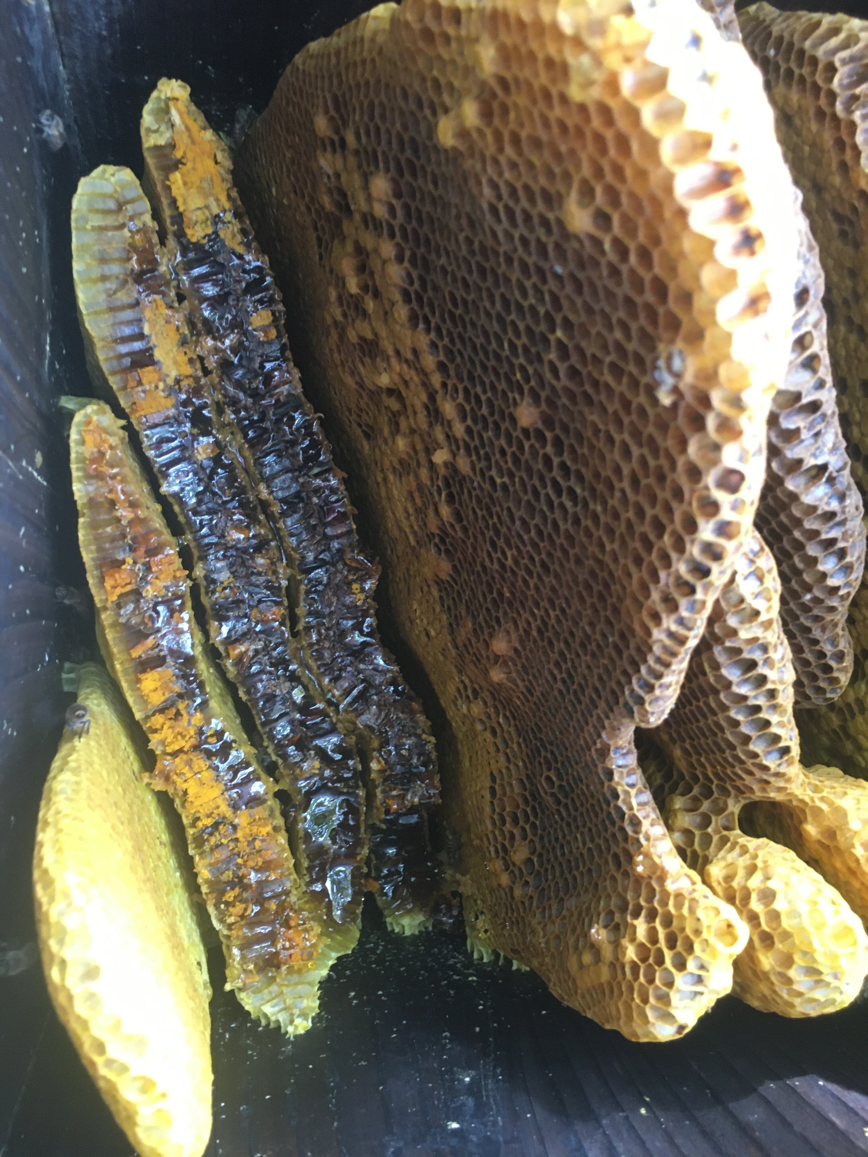 花粉蜜は、蜜蜂の集める野生の花々の栄養素の多い花粉【ビーポーレン】をハチミツを巣から取り出し、たれ蜜に精製する段階で濾過を丁寧に一緒に繰り返しすることによって作られております。